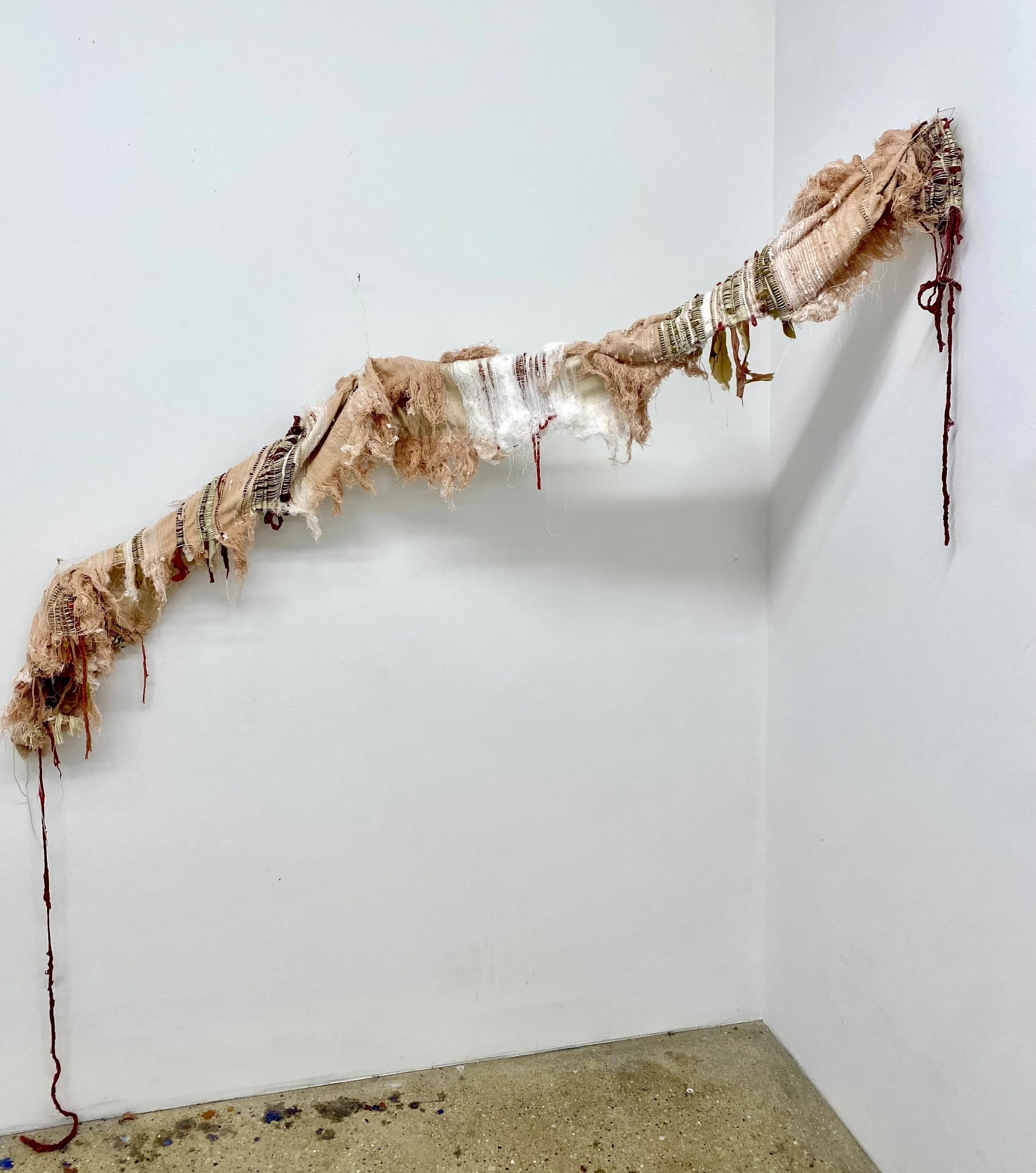The woven sculptures of the Transsuturing series primarily consist of unraveled ace bandages and gauze bandages, which themselves are woven textiles. I pull apart the warp and weft strand by strand for use as the weft in these weavings. Ace bandages have a wide variety of uses, however I draw on my personal associations with them as a means of binding the chest. I utilize gauze bandages, on the other hand, for their association with surgical wounds. In this way they transform from one woven structure to another. These weavings also utilize silk for the warp, as a reference to surgical sutures which are often made from silk. Along with unraveled bandages, long strips of silicone are also woven into the structure. I was drawn to silicone due to its fleshiness and bodily associations. I was also interested in its lumpiness, which to me echoed the exposed flesh I saw in top surgery photos. This torn open flesh, however, exists not hidden under the bandage material, but fully integrated in the structure. The flesh, entrails, wound, or whatever it may be read as, is a part of the bandage weaving, rather than a separate layer hidden underneath.