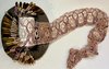 In this in-progress body of work, I pull apart bandages strand by strand then ply them together on the spinning wheel for use in elaborate patterns. I draw on my associations with ACE bandages as a means of binding the chest. Gauze bandages are used for their association with surgical wound care. While this body of work uses store-bought bandages, they are completely reconfigured by the process of unraveling, plying and making the lace. This results in many flaws and imperfections, a result of unraveling thin, breakable threads from a tightly woven bandage. Untitled also involves thicker lengths of handspun yarn.